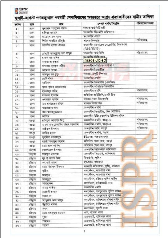 সেনানিবাসে অবস্থানকারী ও আশ্রয়প্রার্থীদের ব্যাপারে গত ১৮ আগষ্ট ২০২৪ তারিখে আইএসপিআর এর আনুষ্ঠানিক সংবাদ বিজ্ঞপ্তি প্রকাশ করা হয় এবং একই দিনে ১৯৩ জন ব্যক্তিবর্গের একটি তালিকা (৪৩২ জন সাধারণ পুলিশ সদস্য ও ১ জন এনএসআই সদস্য ব্যতীত) স্বরাষ্ট্র মন্ত্রণালয়ে প্রেরন করা হয়- যা ছিল একটি মীমাংসিত বিষয়। সেনানিবাসে আশ্রয়প্রার্থী এসকল ব্যক্তি ও পরিবারের সদস্যদের নিরাপত্তা ও জীবন রক্ষার্থে মানবিক দৃষ্টিকোণ থেকে সাময়িক আশ্রয় প্রদান করা হয়েছিল। উল্লেখ্য যে, তৎকালীন বিরাজমান নিরাপত্তা পরিস্থিতিতে আশ্রয়প্রার্থীদের জীবন বিপন্ন হওয়ার সমূহ সম্ভাবনা ছিল। কিন্তু দুঃখজনকভাবে কিছু স্বার্থান্বেষী মহল উদ্দেশ্যপ্রণোদিতভাবে বিভ্রান্তিকর সংবাদ ছড়িয়ে বাংলাদেশ সেনাবাহিনীর ভাবমূর্তি ক্ষুন্ন করার পাশাপাশি জনগণের সঙ্গে দূরত্ব তৈরি করার অপচেষ্টা চালিয়ে যাচ্ছে। এ প্রেক্ষিতে, জুলাই আগস্ট গণঅভ্যুত্থান পরবর্তী সেনানিবাসের অভ্যন্তরে প্রাণ রক্ষার্থে আশ্রয় গ্রহণকারী ৬২৬ জন ব্যক্তিবর্গের একটি পূর্ণাঙ্গ তালিকা (৪৩২ জন সাধারণ পুলিশ সদস্য ও ১ জন এনএসআই সদস্যসহ) এই প্রেস বিজ্ঞপ্তির সাথে সংযুক্ত করা হলো।