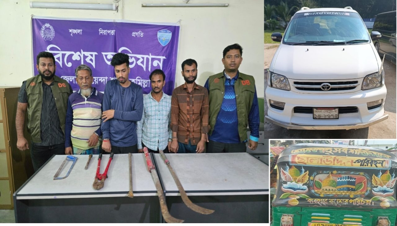 ডাকাতি করার প্রস্তুতিকালে আন্তঃজেলা ডাকাত চক্রের সক্রিয় চার সদস্যকে গ্রেফতার করেছে কুমিল্লা জেলা গোয়েন্দা (ডিবি) পুলিশ। এ সময় তাদের ব্যবহৃত একটি মাইক্রোবাস, একটি সিএনজি অটোরিকশা ও দেশীয় অস্ত্রশস্ত্র জব্দ করা হয়েছে।