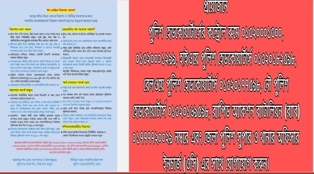 প্রয়োজনে পুলিশ হেডকোয়ার্টার্সের কন্ট্রোল রুমে ০১৩২০০০১৩০০, ০১৩২০০০১২৯৯, হাইওয়ে পুলিশ হেডকোয়ার্টার্স ০১৩২০১৮২৫৯৮, রেলওয়ে পুলিশ হেডকোয়ার্টার্স ০১৩২০১৭৭৫৯৮, নৌ পুলিশ হেডকোয়ার্টার্স ০১৩২০১৬৯৫৯৮, র‍্যাপিড অ্যাকশন ব্যাটালিয়ন (র‍্যাব) ০১৭৭৭৭২০০২৯ নম্বরে এবং জেলা পুলিশ সুপার ও থানার অফিসার ইনচার্জ (ওসি) এর সাথে যোগাযোগ করুন।